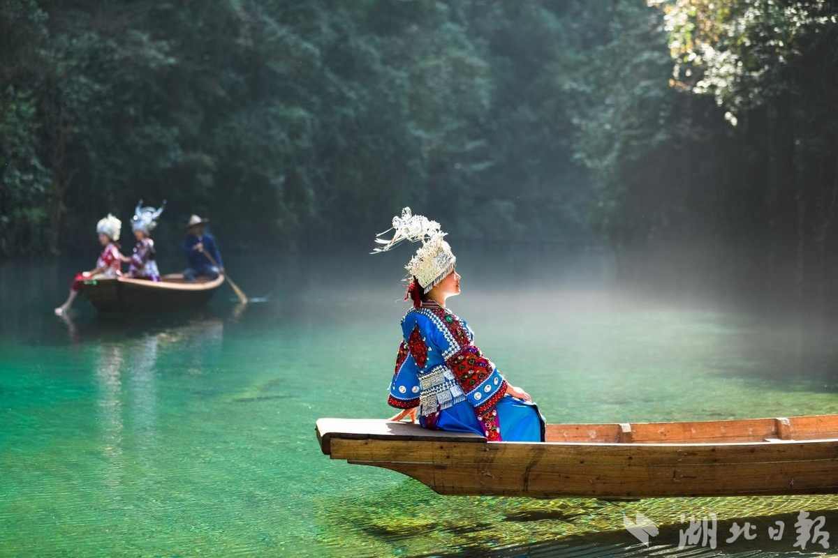 鹤峰县屏山大峡谷,因山侧屏立而得名。峡谷底部碧蓝如镜的河水,随着裂缝中照进来的光束,在水底投射出船影,宛若悬浮,独特而绝美,让人一秒入画。