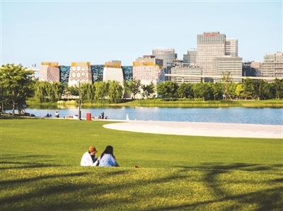 游客在上海世博文化公园的音乐之林草坪上休闲。资料图片