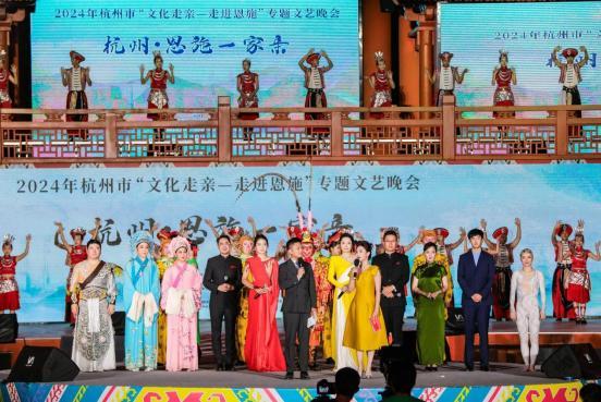以“缘相亲心相近 ”为主题的杭州-恩施文化走亲文艺演出也在恩施女儿城广场举行,这场演出搭建起文化桥梁,紧密地连接恩施与杭州,共绘文化交流与情感共鸣的图景 。