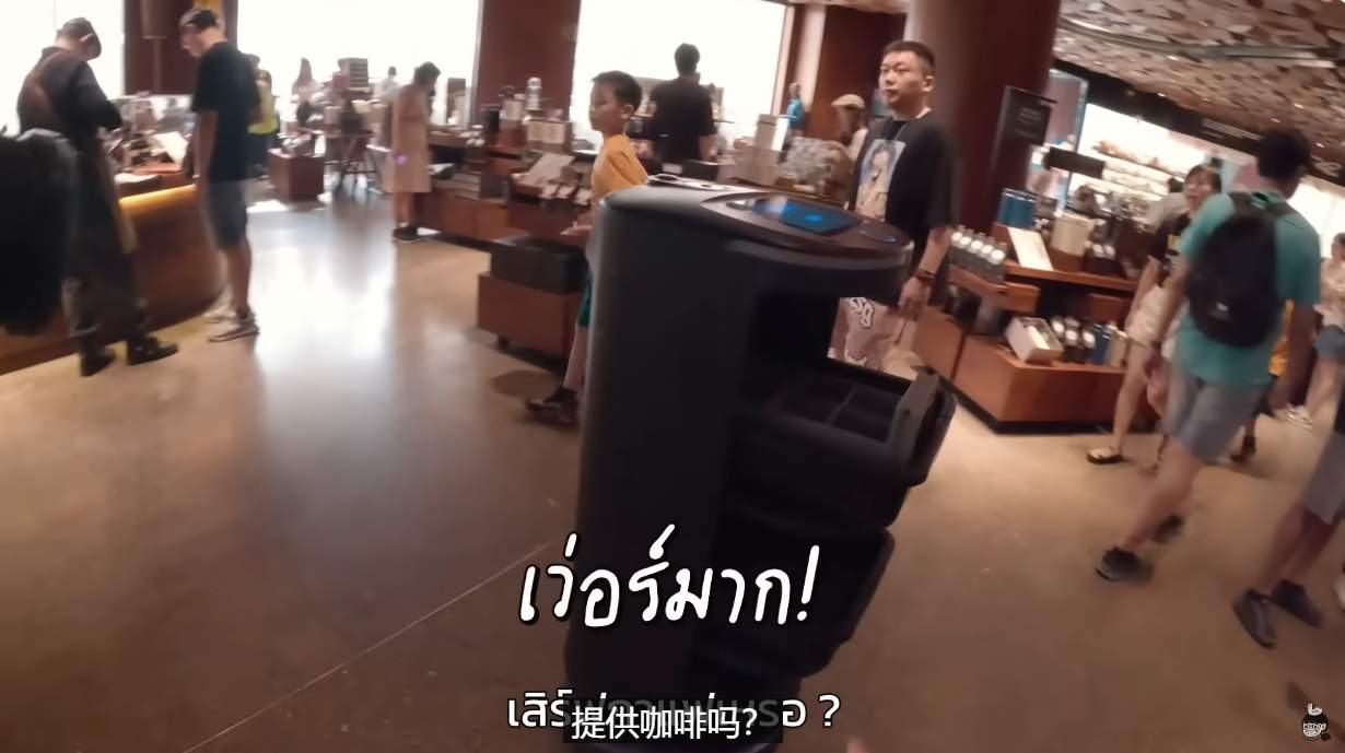 外国游客在咖啡厅发现智能机器人。
