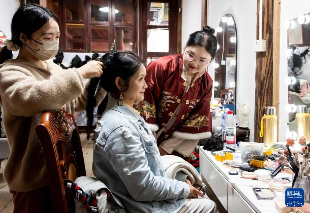 2月3日,在福州三坊七巷一处“三条簪”化妆跟拍点,化妆师在为来自上海的母女进行“三条簪”妆造。 春节假期期间,福州市千年古街三坊七巷的游人络绎不绝,众多头戴“三条簪”和“簪花”的游客在此打卡拍照,在浓浓的传统文化氛围中欢度春节。