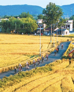 骑行爱好者在安徽省芜湖市水口村麦田间骑行。