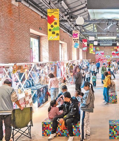 巨型游戏手柄、各种动画人物的彩旗绘画、糖果形状的气球墙……“五一”假期,辽宁省沈阳市铁西区红梅文创园内的厂办大集吸引了众多市民、游客。