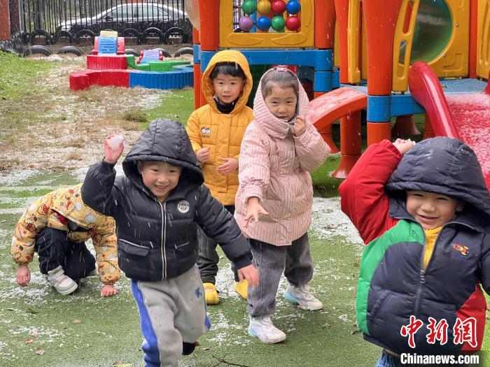 1月22日,桂林市区一所幼儿园,孩子们在打雪仗。