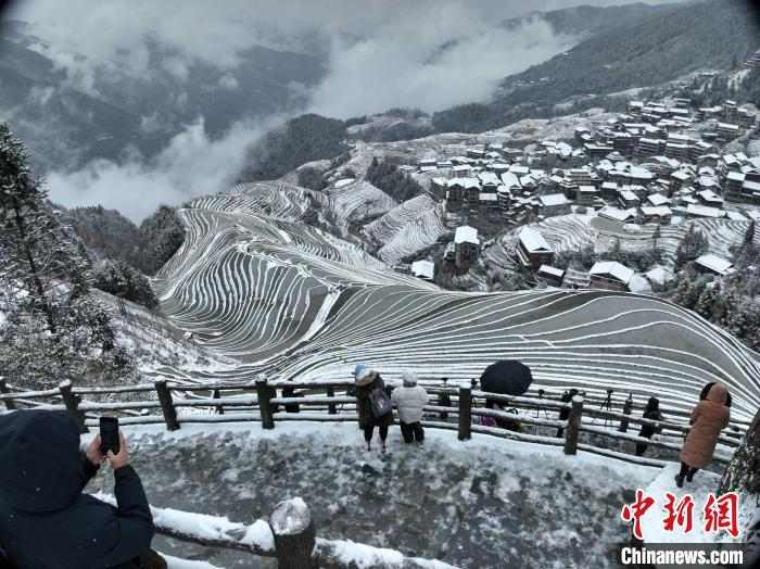 1月22日,游客在广西龙胜各族自治县龙脊梯田拍摄雪景。