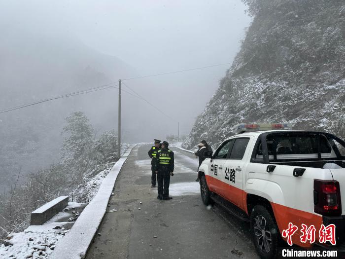 桂林交警部门在临桂区黄沙瑶族乡道路上查看积雪情况。