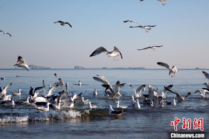大量海鸥聚集烟台第一海水浴场,吸引游客前来观赏。