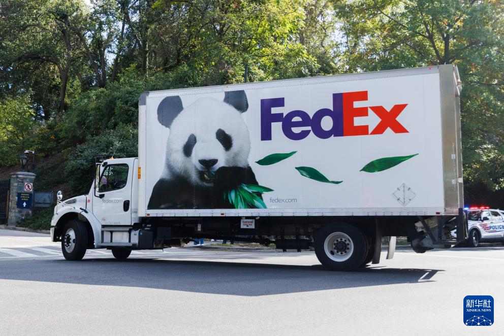 10月15日,在美国首都华盛顿 ,运送大熊猫的卡车即将驶入华盛顿国家动物园。当日,大熊猫“宝力”和“青宝”抵达美国华盛顿国家动物园,开启为期10年的旅居生活。