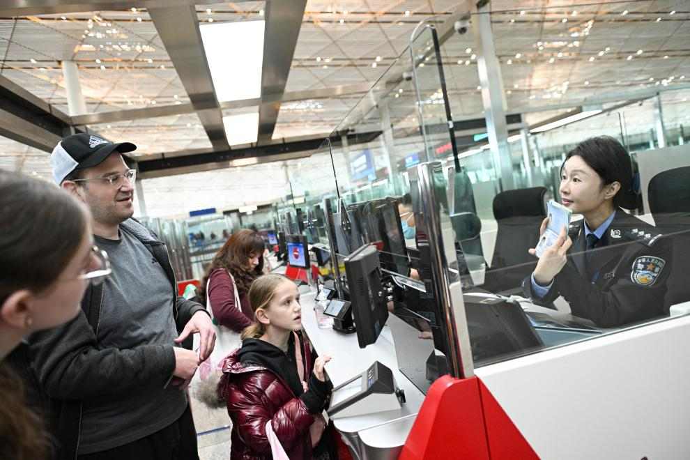 1月28日,边检民警陈苗(右一)为几位美国游客办理过境免签手续。