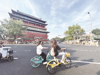 游客骑行体验北京钟鼓楼