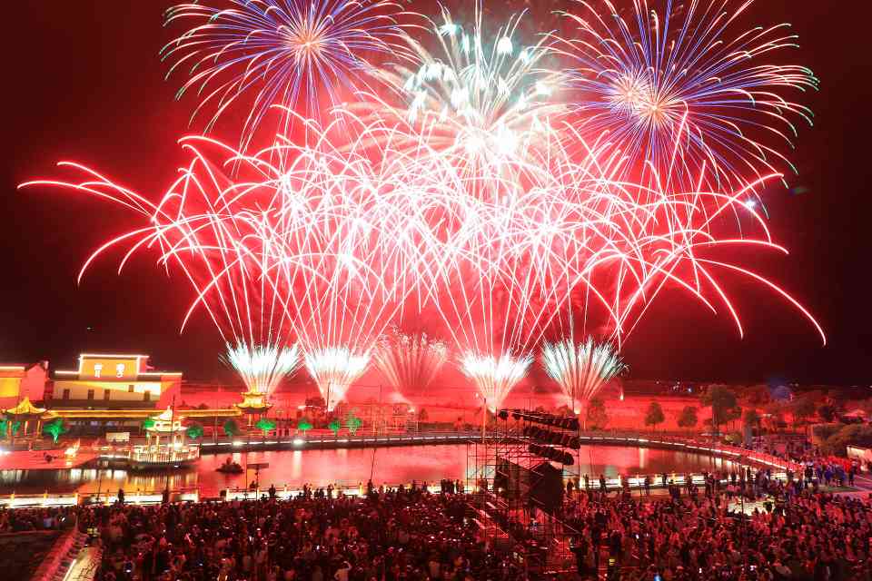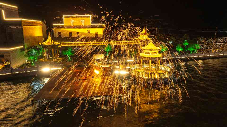 锣鼓喧天,乐声悠然,稻香萦绕,秋月当空。夜色中,歌舞晚会正在上演,国风音乐与现代歌舞交织相映,叙述着进贤的历史与人文。水塘边,一场“火壶+打铁花”的非遗表演吸引游客的注意,炽热的铁水打向高空,铁花璀璨如烟花绽放,似万千繁星倾泻而下。