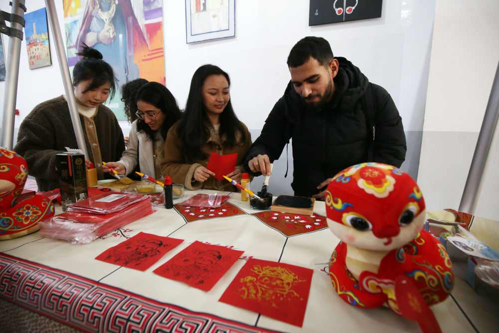 1月20日,在阿尔及利亚的阿尔及尔第二大学,中阿青年在“欢乐春节——中华文化进校园”活动中共同制作年画。