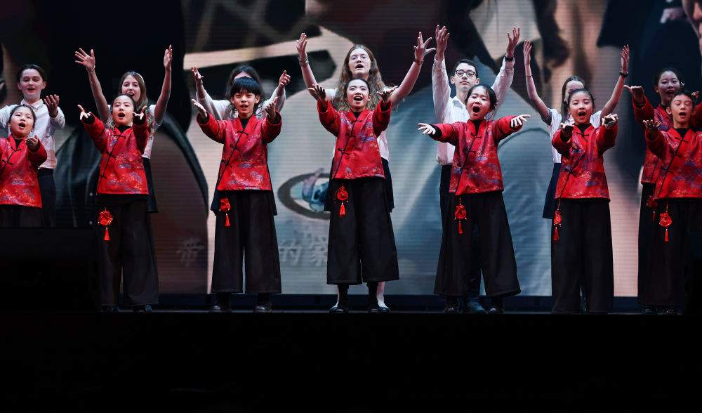 1月20日,在法国巴黎举行的“金蛇献瑞”巴黎春节联欢晚会上,中法青少年合唱《歌声与微笑》。新华社记者 高静 摄