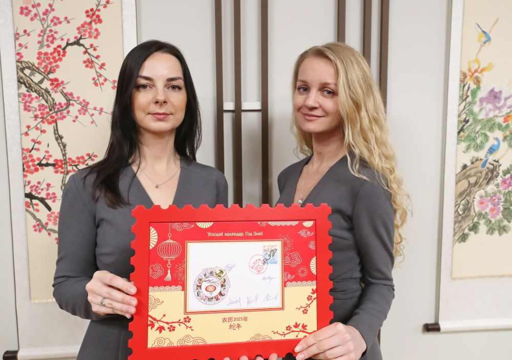 1月15日,工作人员在白俄罗斯明斯克展示《东方历法:蛇年》邮票首日封。(任科夫摄)