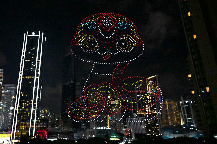 1月25日,在马来西亚吉隆坡举行的2025年“欢乐春节”全球启动仪式前,无人机展示蛇年主题图案。新华社记者 程一恒 摄