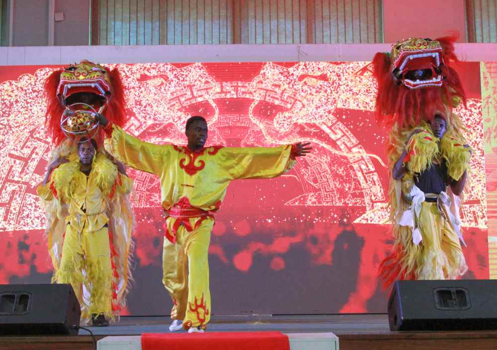 1月11日,在津巴布韦首都哈拉雷举行的华侨华人新春庙会活动上,津巴布韦青年舞狮团进行舞狮表演。(塔法拉摄)