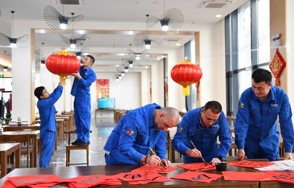 1月23日,在伊拉克米桑油田,中海石油伊拉克有限公司中外员工一起写春联,挂灯笼。(中国海油中东区域供图)