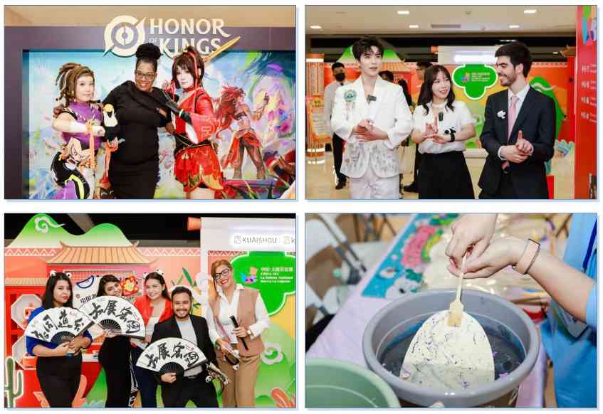 市集现场,更多新奇玩意儿层出不穷。比如中国国宝“大熊猫”可以戴在头上、抱在身前:总台央视网“熊猫频道”带来各色大熊猫文创,向拉美和加勒比国家友人尽情释放大熊猫的“萌魅力”。又如从中国游戏中走出的“英雄”人物与你现场互动,邀你走进游戏的拉美片区,在赛博世界中继续跳桑巴舞、玩儿街头艺术……