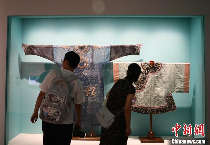 7月16日,四川成都,参观者观看蓝纱地绣八宝云龙纹单袍(左)和淡青暗花缎绣花蝶大襟女褂。当日,“青·韵——文物里的中国传统色彩美学”特展在成都金沙遗址博物馆启幕。此次展览汇聚了故宫博物院、湖南博物院等20余家文博机构的200余件/组青色系文物,尽显文物里的青色之美。中新社记者 王磊 摄