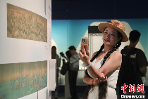 7月16日,四川成都,参观者拍摄王希孟《千里江山图》(局部 喷绘)。当日,“青·韵——文物里的中国传统色彩美学”特展在成都金沙遗址博物馆启幕。此次展览汇聚了故宫博物院、湖南博物院等20余家文博机构的200余件/组青色系文物,尽显文物里的青色之美。中新社记者 王磊 摄