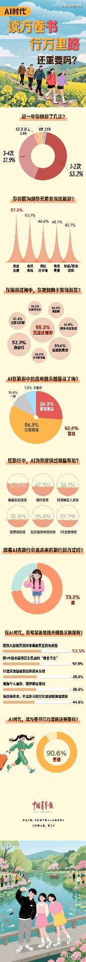 用AI工具一键生成个性化旅游路线、实时预测景区人流量……AI技术正在重构青年旅行图景。近日,中国青年报社发布的《2025中国青年旅游观察报告》显示,82.6%的受访青年认为AI在旅游中的应用越来越普及,智能规划路线(57.2%)、制作预算(42.5%)、预测景区人流量(38.1%)是受访青年在旅行中常用的AI功能。73.5%的受访青年认为跟着AI去旅行会是未来出游新方式。90.6%的受访青年认为,尽管在AI时代,足不出户可阅历史、览山河,但读万卷书、行万里路依然重要。