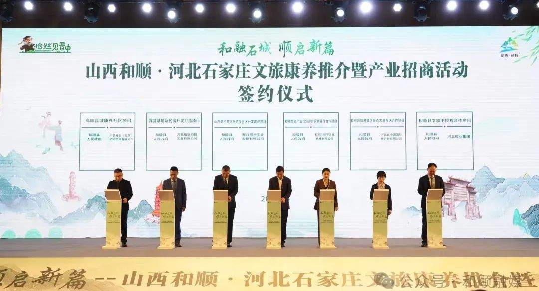 推介会现场,和顺县与中艺雅集(北京)文化艺术有限公司、河北禧瑞柏悦实业有限公司、邢台邢州实业股份有限公司、石家庄峰宁文化传播有限公司、河北省中国国际旅行社有限公司、河北敬业集团集中签署战略合作协议,将在高端县域社区康养、露营基地及民宿开发打造、山西鹊桥文化旅游度假区开发建设、和顺文旅产业规划设计、营销宣传、客源互送、文旅IP授权等方面深度合作。
