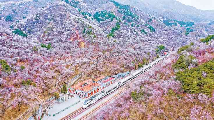 北京市郊S2线铁路穿梭在烂漫花海间,给进京旅客留下美好的“北京第一印象”。北京日报记者 潘之望摄