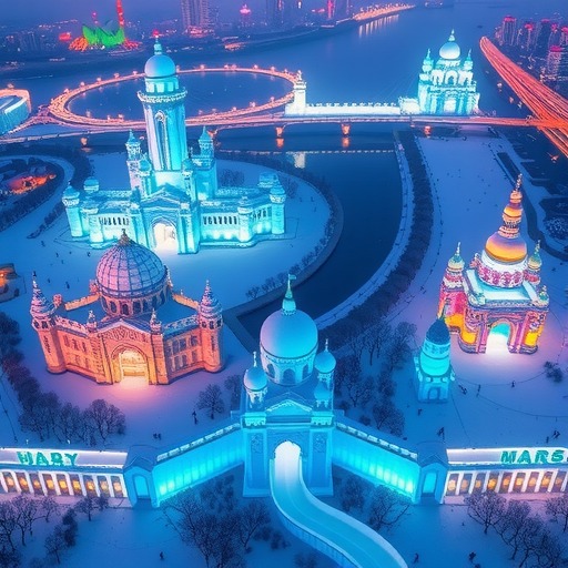 太阳岛雪博会规划150万平方米空间,总用雪量12万立方米,建设艺术雪雕260余处,联同熊猫戏雪、企鹅巡游、虎啸雪原等场景,形成人与自然和谐共生的冰雪奇观。
